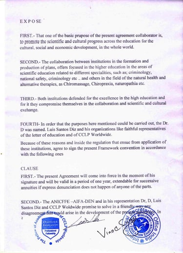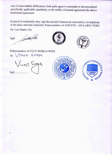 AIFA-DEN Formación opera bajo el Amparo del Convenio Marco de Colaboración Científica y Cultural suscrito con la Organización Internacional CCLP Worldwide, representante de la Carta Internacional de la Educación.
