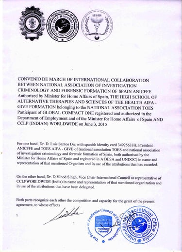 Este respaldo institucional, otorgado por el Dr. Vinod Singh (Presidente de CCLP Worldwide) al Dr. Luis Santos Diz, garantiza que nuestros programas de formación en Terapias Alternativas y Ciencias de la Salud cumplen con los criterios de excelencia exigidos por organismos internacionales de primer nivel.
